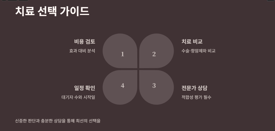 중입자 치료는 현재 의료 기술 중 가장 진보된 암 치료 방법 중 하나입니다. 고가 치료임에도 불구하고, 치료 효과, 회복 속도, 삶의 질 측면에서 많은 암 환자들에게 새로운 희망이 되고 있습니다. 비용, 대기 기간, 치료 가능 암의 조건 등을 충분히 고려해 신중한 판단과 전문가 상담을 통해 최선의 선택을 하시길 바랍니다.