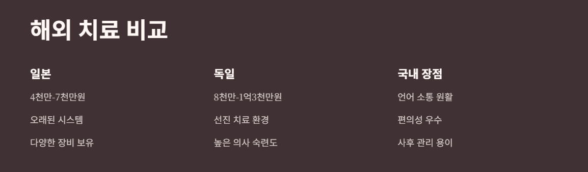 일본과 독일은 중입자 치료 시스템이 오래전부터 도입되어 있고, 장비도 다양하게 보유하고 있습니다. 치료 환경, 의사 숙련도, 언어 장벽 등을 고려했을 때 국내에서 치료받는 것이 편의성 측면에서 유리할 수 있습니다.