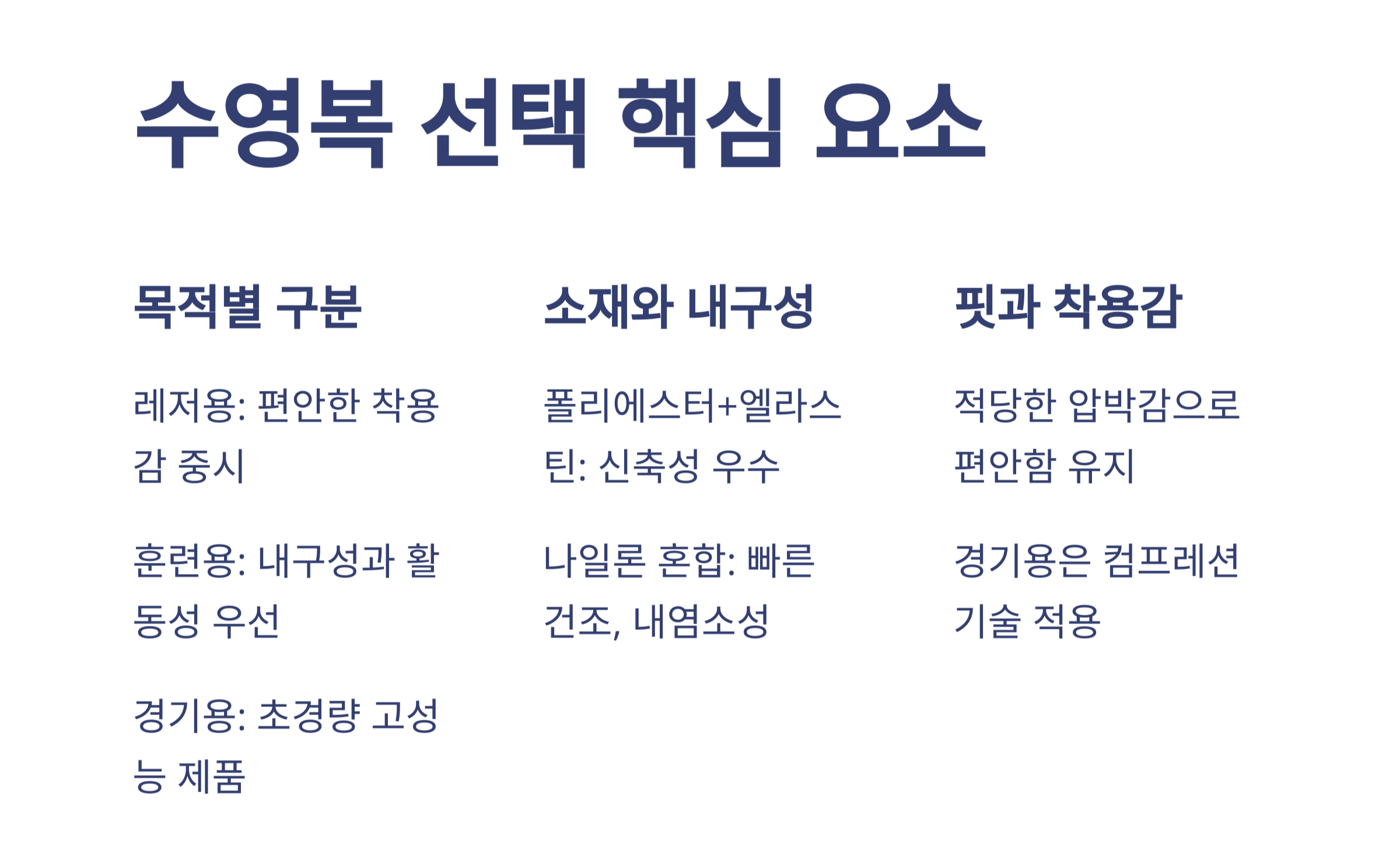수영복의 착용감은 핏에서 결정됩니다. 몸을 적당히 압박하면서도 장시간 착용 시 불편하지 않아야 하며, 경기용의 경우 컴프레션 기술로 물의 저항을 줄일 수 있어 경기력을 향상시켜줍니다.