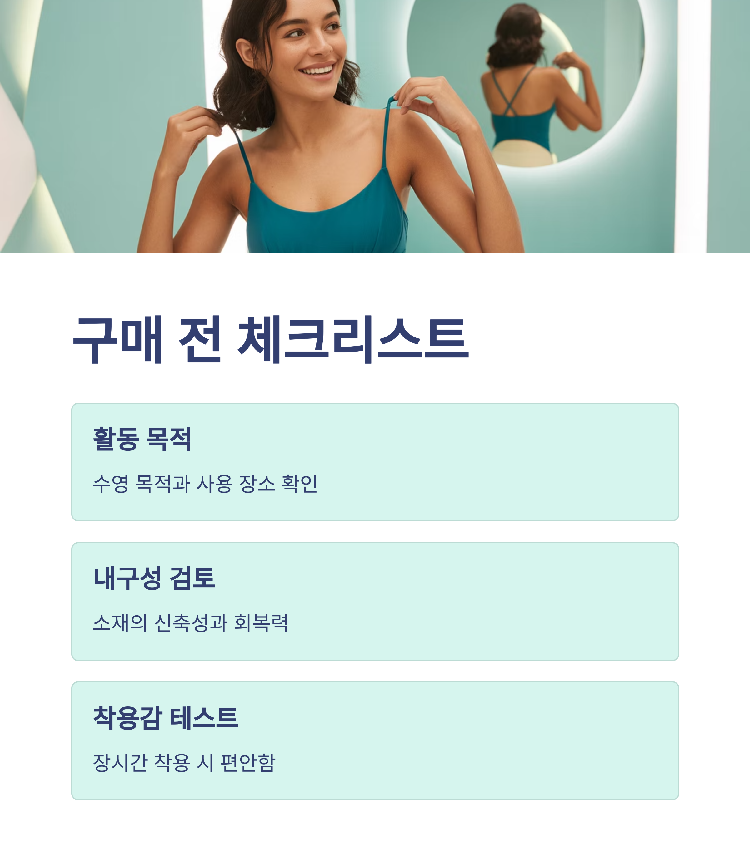가장 중요한 건 자신의 사용 목적과 활동성에 맞춘 선택입니다. 트렌디한 디자인도 좋지만, 신체를 편안하게 지지해주고 오랜 시간 지속적으로 착용할 수 있는 제품이야말로 진짜 좋은 수영복입니다.
