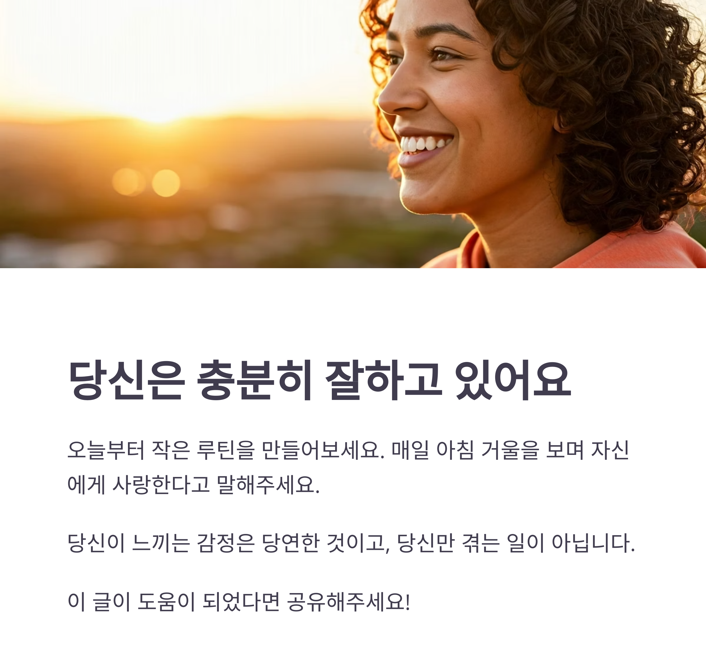 오늘부터 작은 루틴을 만들어보세요. 매일 아침 거울을 보며 "오늘도 수고할 나 자신, 사랑해"라고 말해주거나, 퇴근 후 10분이라도 나만을 위한 시간을 갖는 식으로요. 당신이 느끼는 감정은 당연한 것이고, 당신만 겪는 일이 아닙니다. 우리는 모두 같은 하늘 아래서 비슷한 고민을 하며 살아가고 있어요. 당신은 혼자가 아닙니다.